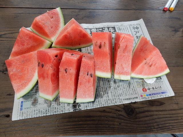 ドコからか(裏の野菜直売所か?)スイカの差し入れがあり、皆さんで