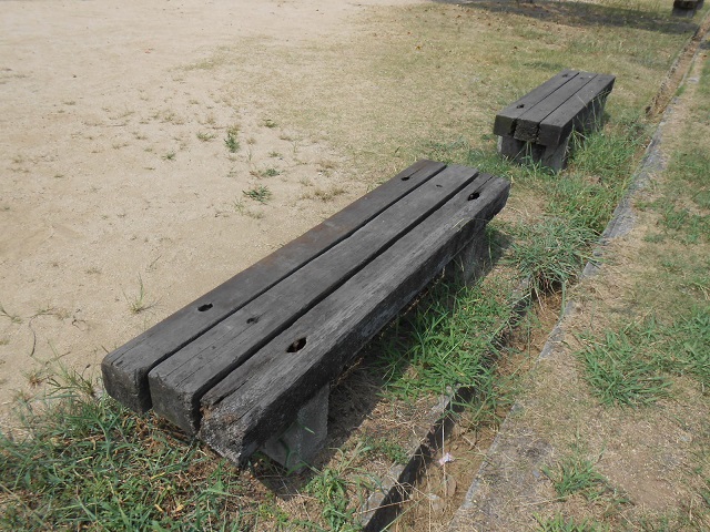 敷地内にあるベンチも、見た感じ枕木の廃物利用でしょうか?