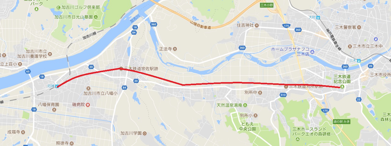 三木鉄道と概ね並行して、県道20号線が走ってますので、基本的には