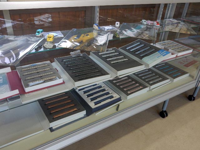 ガラスケースには鉄道模型やクリアファイルなどのグッズがありますが、