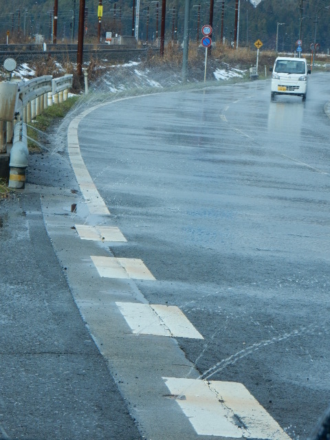雪国らしく道路脇に散水設備があり、水が噴き出してるのはイイとして