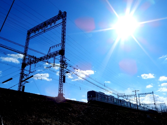 築堤を走る車両が逆光でイイ感じだったので、ワザとコントラストを