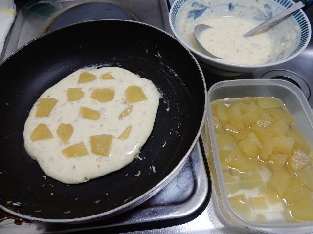 ホットケーキミックスなどを買ってきて、煮たリンゴをお好み焼きの要領