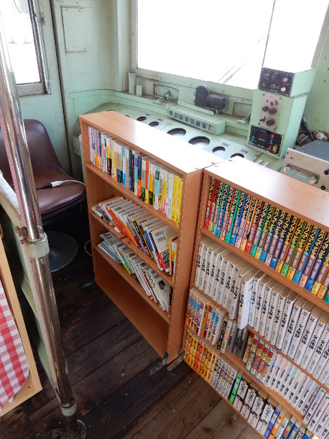 運転席スペースには、漫画本を中心にした書架もありますので、食後に