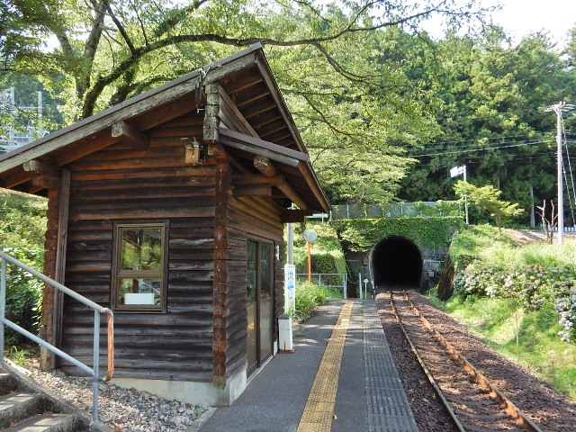 山間の盆地に造られた駅ですね。駅舎はなくログハウス風の待合室が