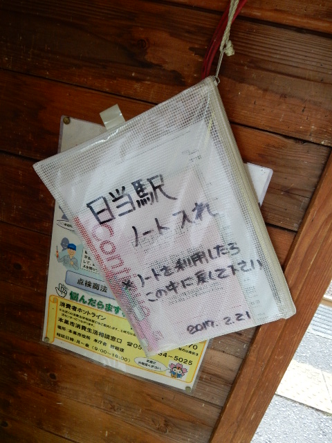 その待合室内に、クリアケースを吊るした状態で駅ノートが存在します。