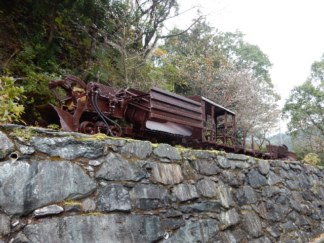 駐車場の石垣の上に先程も見たような鉱山鉄道の車両がモニュメント