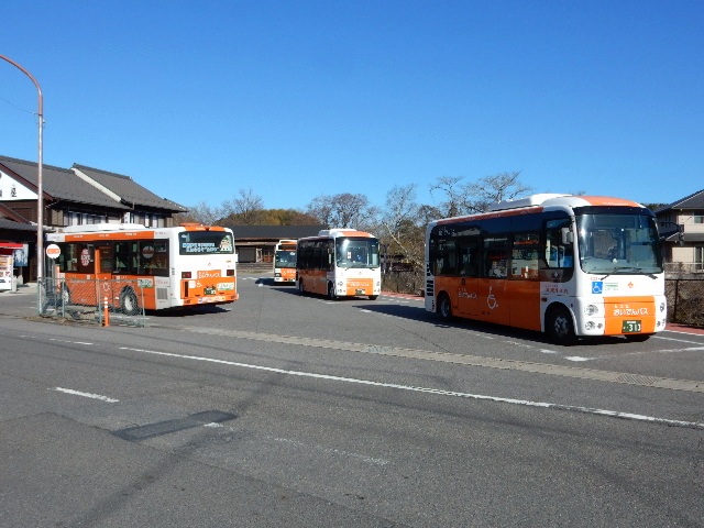 小型の路線バスが一度に4台とか5台とか集まって同時発車するん
